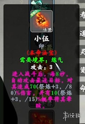 屬性:進入戰斗後每8秒自動攻擊最近目標,對其造成70(祭煉+3,/80)%傷害,並有10(祭煉+3,/15)%概率將其暈眩