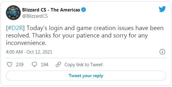 暴雪在上周末關閉《暗黑破壞神2:重製版》伺服器進行緊急維護後,許多人依然遭遇登錄問題。隨後暴雪官方表示正在調查連線問題,大約6小時後,暴雪聲稱伺服器問題已經解決。暴雪說:「登錄和游戲創建問題已經解決,謝謝你們的耐心等待,並對造成的不便表示歉意。」