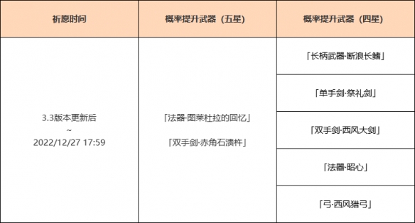 活動期間,限定五星武器「法器·圖萊杜拉的回憶」「雙手劍·赤角石潰杵」的祈願獲取概率將大幅提升。