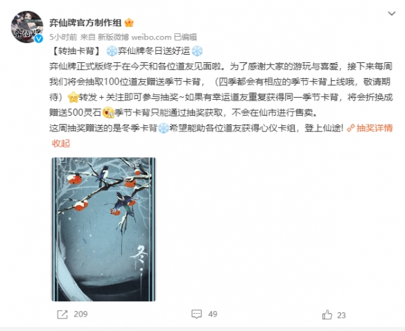 以上就是弈仙牌冬季卡背獲得方法介紹全部內容,想要了解更多相關攻略的小夥伴可以持續關注,這裡每天會為大家推送最新最全的攻略,一定不要錯過哦。