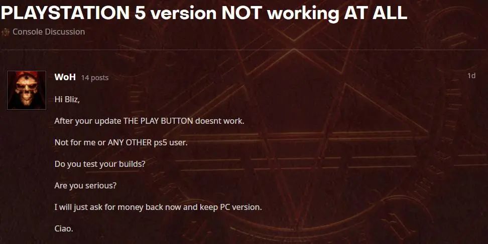 近日,PS5歐服玩家發現《暗黑破壞生2 重製版》在下載安裝最新補丁後無法進入遊戲,於是在昨日(10月13日)暴雪官方論壇出現大量報錯的帖子,根據這些報錯帖子的說法,玩家可以進入初始界面但點擊開始遊戲沒有任何反應,即便是角色更換、創建新角色也無濟於事。