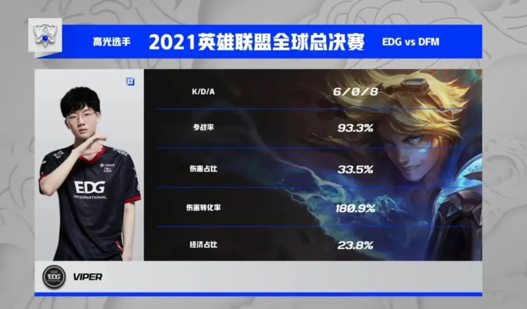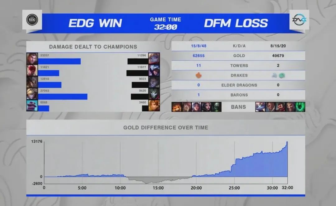 連續兩場表現滿分的EDG今天對戰DFM的比賽看起來只是為LPL又一個全勝日的散場表演。但沒想到這場比賽前期反而讓大家血壓拉滿。DFM上中野突然爆種,在前期打出5-0的大比分,一下子嚇出了不少老觀眾的PTSD,彷彿那個爆冷輸給外卡的EDG又回來了。好在一號種子的實力終究無法動搖。EDG利用完美的運營反超經濟,一波團戰就完全改變了比賽局勢,有驚無險地全勝結束了小組賽首輪。