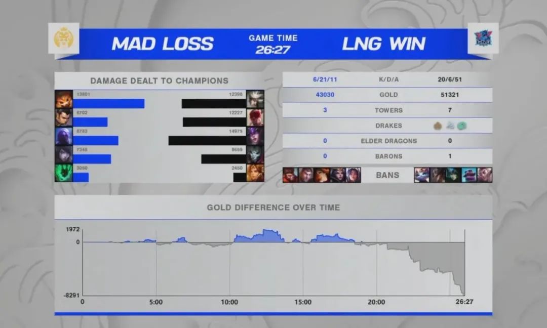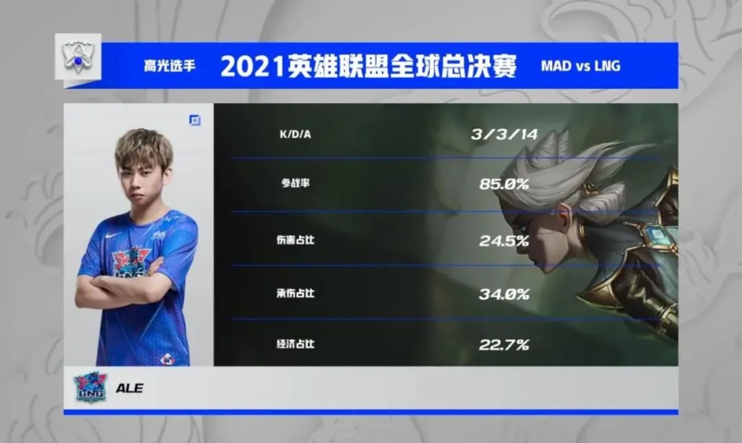 面對上野狀態火熱的LNG,MAD選擇以支援為主的一套陣容,保證上單的對線,隨後通過中野輔的聯動和LNG打的有來有回。但失誤總會出現,被LNG抓住機會,在拉鋸戰中LNG逐漸找到了手感,Ale的卡密爾在團戰中存在感拉滿,最後野區一波團戰一腳E閃留下三人,直接為LNG鎖定了比賽勝利。