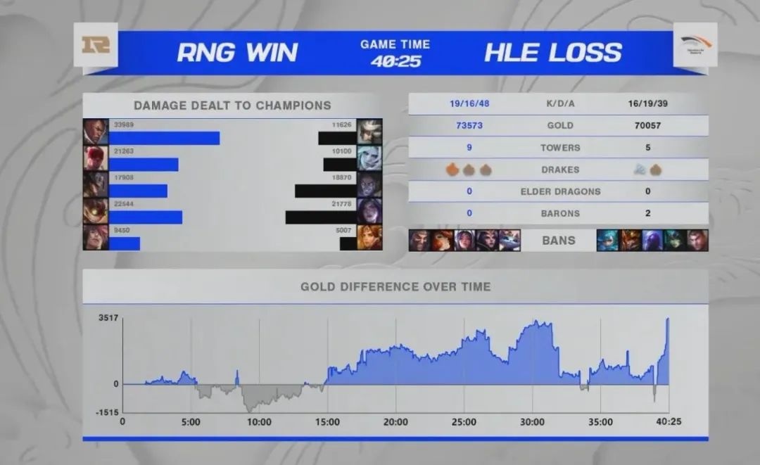 面對HLE,RNG選出卡牌為軸的中上野體系,Xiaohu拿出了14戰100%勝率的盧錫安,前期HLE頂住壓力,卡莎也順利發育,但RNG的兵線始終占據主動性,中期人頭落後,而經濟領先,加之HLE頻頻出現失誤,最終一波龍團毀一生,被RNG順勢帶走。至此RNG三戰全勝!