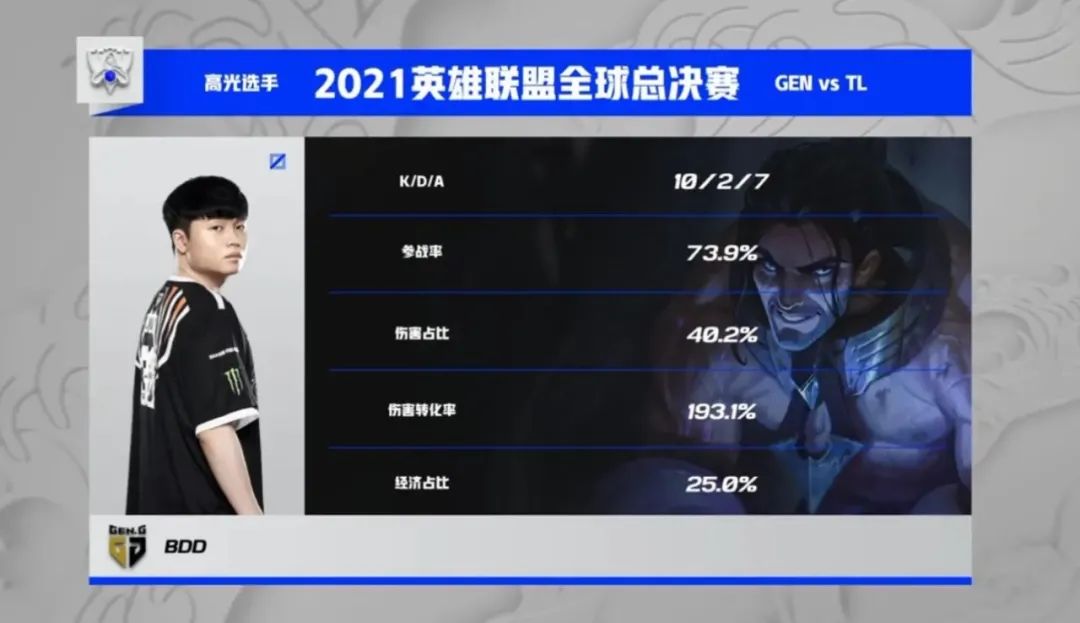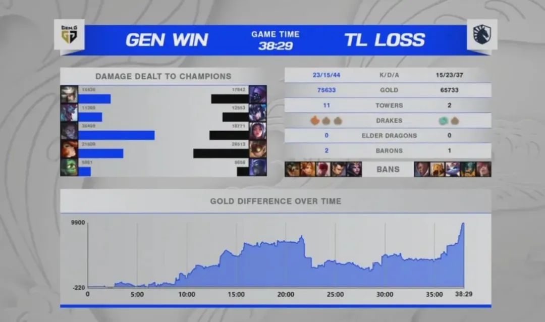開局贏了一場MAD以後就開始走下坡路的TL又遇上了強敵GEN,CoreJJ無心跟老隊友Ruler對線,全程跟著打野中單到處遊走開戰,而GEN輕鬆地接住了TL前期的三板斧,用完美的反擊節奏獲取了較大優勢,眼看著這局比賽又要發展成一邊倒的碾壓,GEN在推高地時忽然送了一波大的,被TL多拖了十多分鐘,不過最終TL還是無法處理Ruler的女槍,將勝利送給了GEN。