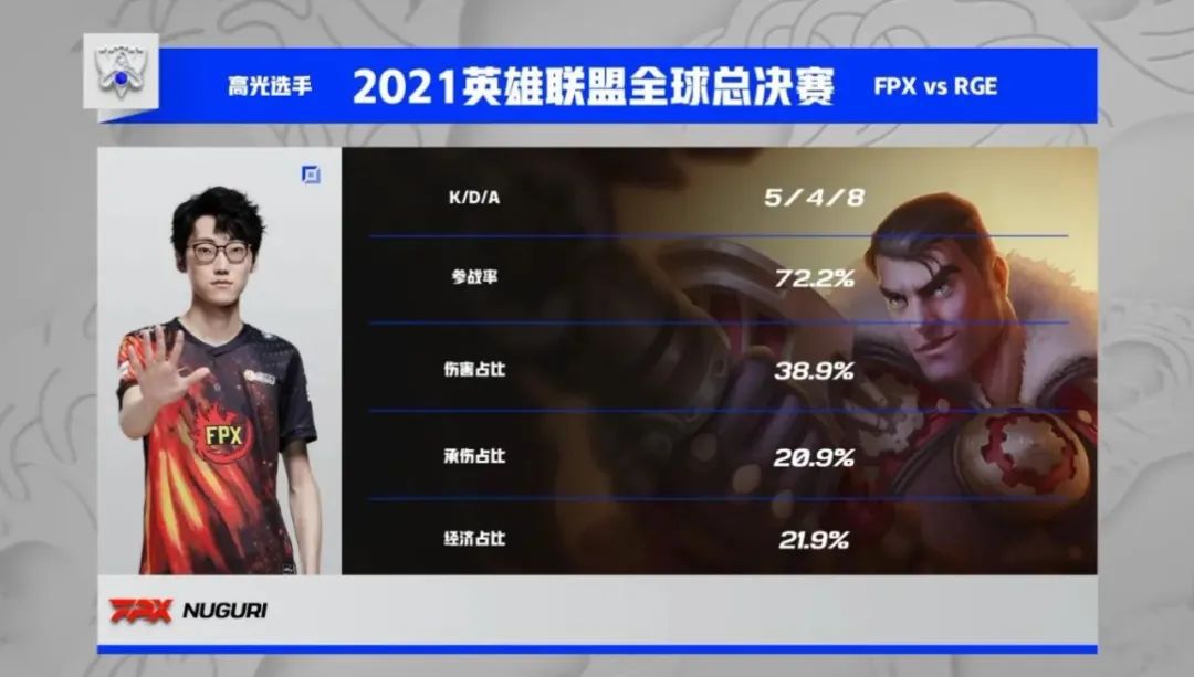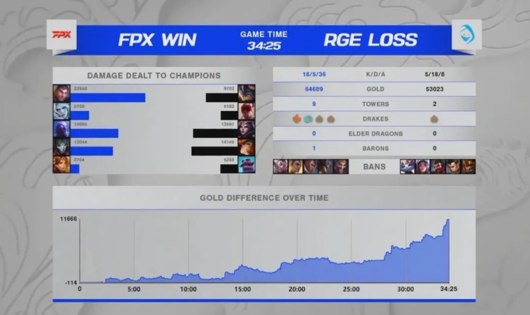 經歷前兩天的跌跌撞撞,FPX逐漸摸索到了版本走向,隊員的狀態也有明顯的上升,Doinb一手法王瑞茲在前期給RGE帶來很大壓力,而Tian的佛耶戈在團戰中操作拉滿,Nuguri對位多次單殺蘭博直接打穿邊線,盡管RGE一直在努力找機會反打,Hans sama的表現也非常好,但最終難敵漸入佳境的FPX眾人。FPX穩穩拿下這局比賽勝利,保留了爭奪小組第一的希望!