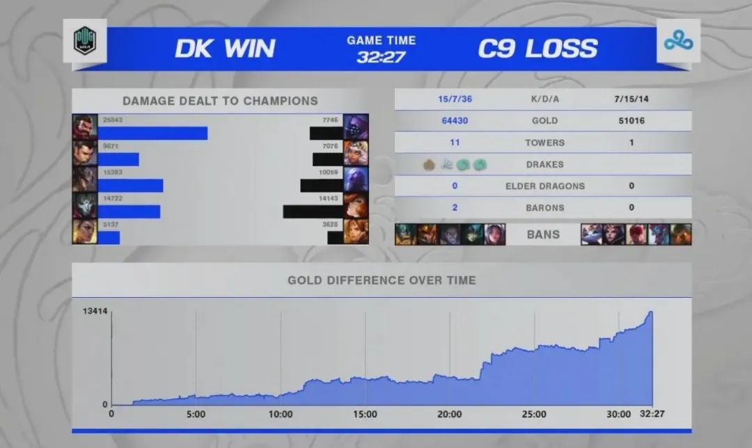 神奇的C9似乎擁有能跟任何對手有來有回但是就是無法取勝的魔咒。他們在前期和DK的中野進行對抗不落下風,並且多次抓到了DK狀態最差的下路,但DK依然牢牢將比賽主動權抓在手裡,穩健的如同一座山峰,打到後期C9全員操作變形決策迷幻,只能躺平迎來了己方的三連敗。DK穩健3-0結束小組賽首輪,他們依然是S11的最大奪冠熱門。