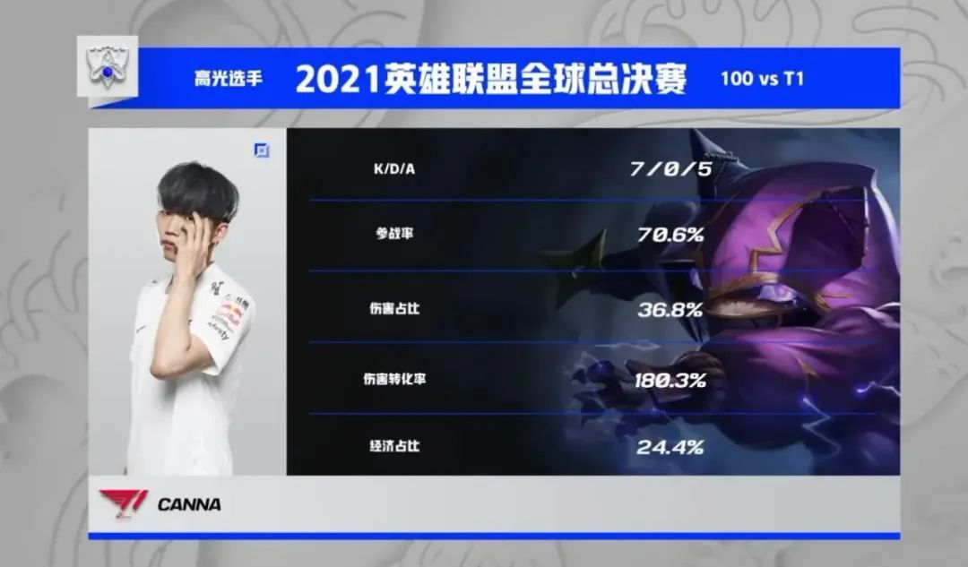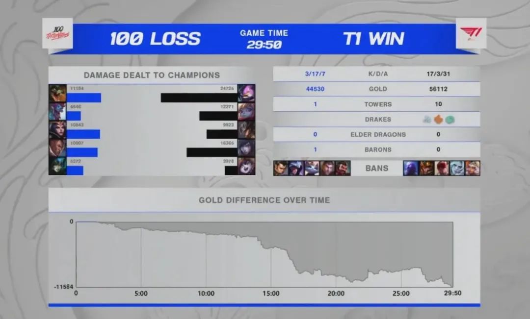 雖然沒有能在焦點戰中戰勝EDG,面對同組其他對手的T1還是擁有很大優勢的,傾向於前中期主動進攻的他們面對100T這樣極其依賴中野節奏的隊伍可以說打起來毫不費力。卡牌大師似乎成為最近各個隊伍都開始嘗試的熱門選擇。T1從上半區撕開巨大破口滾起雪球,盡管中期意外被搶到一條大龍,但對於比賽的結果並無影響。2-1,T1目前排名小組第二緊隨EDG其後。