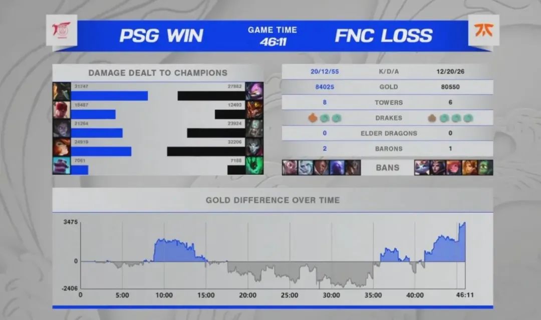 原本以為剛剛擊敗HLE的PSG會高歌猛進輕鬆戰勝失去主心骨的Fnatic,但沒想到PSG沒適應Fnatic不顧一切兇猛進攻的打法,在亂戰中迷失了自我,差點陰溝翻船。好在中期他們逐漸清醒過來,利用更好的協作能力漸漸把局勢扭轉過來,最後還是有驚無險地拿下了比賽勝利。而Fnatic遭遇了慘淡的三連敗,小組出線希望已經極為渺茫。