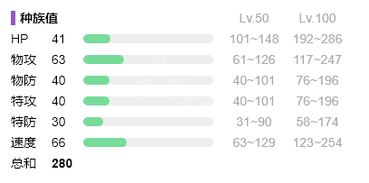 初始親密度: 0努力值: 速度+1 捕捉率: 255% 孵蛋步數: 5140 性別: 雌性: 50.00% 性: 50.00%