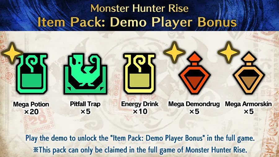 試玩體驗版後,即可在正式版《怪物獵人:崛起》中獲得「【體驗版遊玩特典】道具包」。
