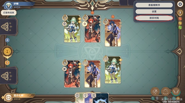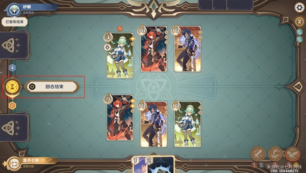 當元素骰子數量沒有了,或者不夠使用技能的時候,可以宣布回合結束;優先點回合結束的,下局會先手開局。