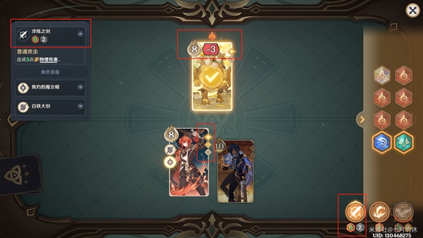 如果對方卡牌上有元素附著,使用帶元素傷害的技能,就能發生元素反應,增加傷害。