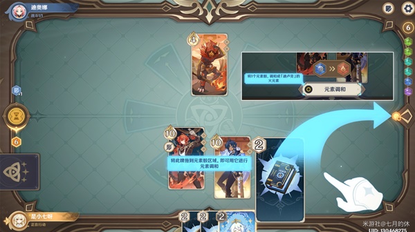 如果沒有角色所需要的元素骰子,可以選擇不要的行動手牌,往右邊拖丟棄,就可以進行元素調和,把任意元素骰子,轉換成出戰角色的元素骰子。元素調和同樣不佔用回合!使用後可以繼續使用技能!