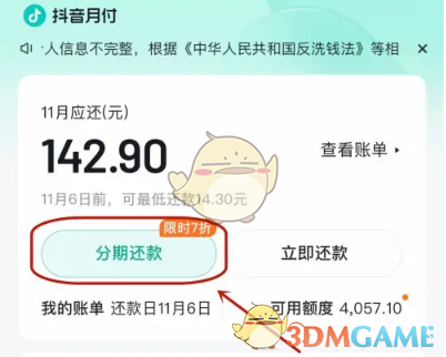 3、在這里可以看到自己需要還款的金額,點擊「分期還款」