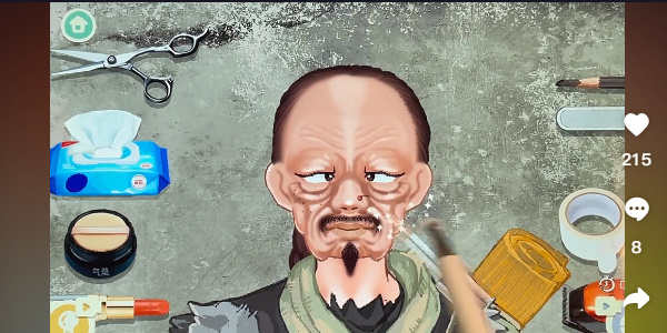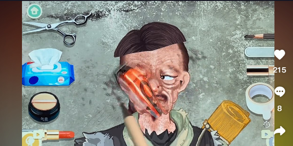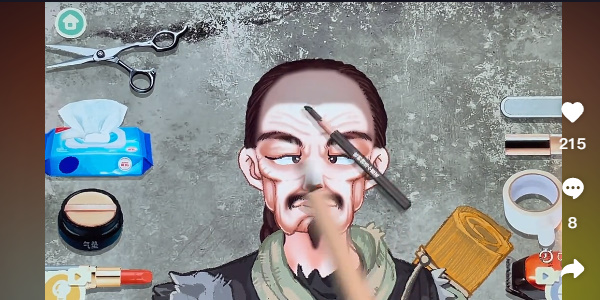 5、然後我們用白色膠帶把臉上皺紋提拉起來,塗上口紅。