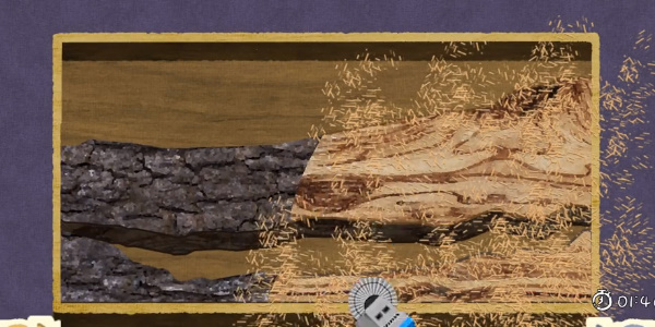 《收納物語》星辰大海通關攻略:1、首先我們擺好兩根燒黑的木頭,用電鋸磨平整。