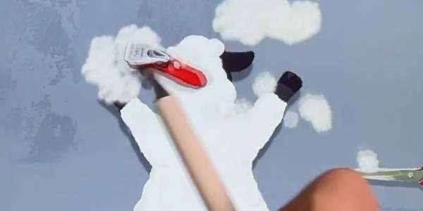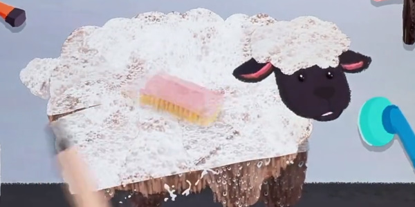 2、接著我們在羊身上擠沐浴露,用粉色刷子刷刷起泡。