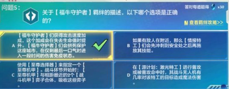 答案:A.【福牛守護者】們獲得攻擊速度加成,這個加成會在失去生命值時提升。【福牛守護者】們會拚死保護這座城市,在僅剩最後一口氣時進入一段時間的傷害免疫狀態。
