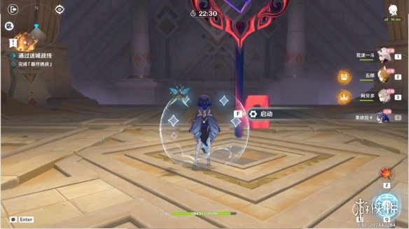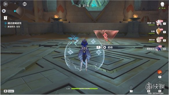 技能釋放順序:萊依拉QE-五郎QE-阿貝多QE-荒瀧一斗EAAAQAAA。(為避免迷路,從最終試煉位置出發,可先激活地圖東西兩邊的符文)