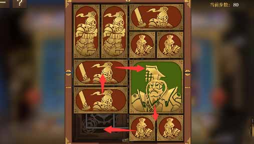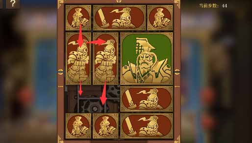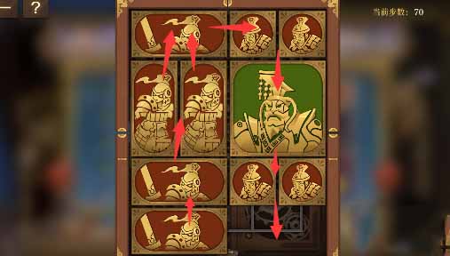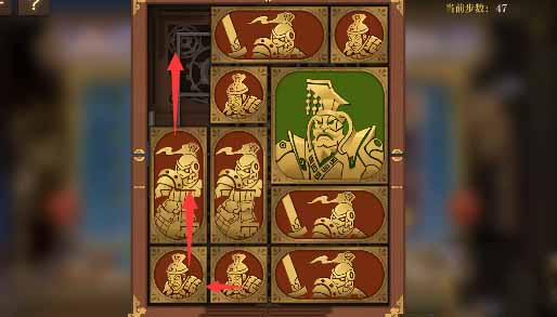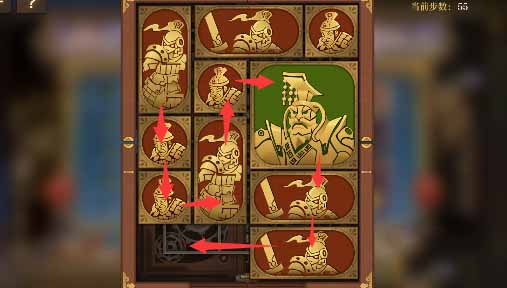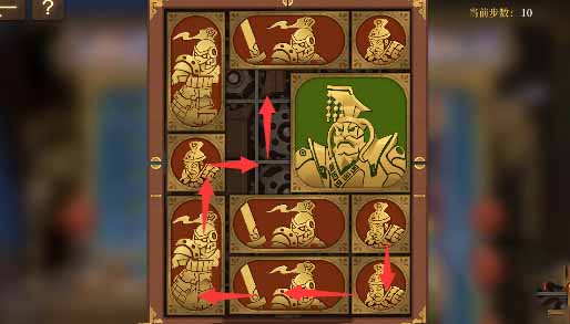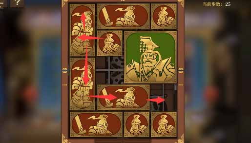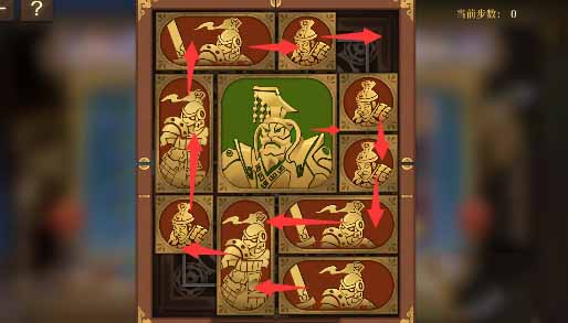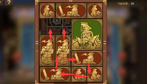 8、最上方的水平方塊向左移動一格,其下方的小方塊移動上去,將軍向上移動一格,左側的小方塊移動到將軍的下方,然後水平方塊全部移動到左下角。