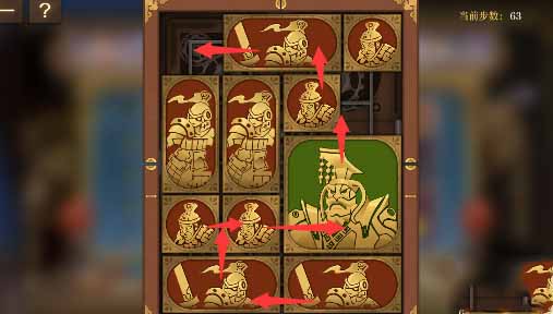 10、下半部分的方塊繼續順時針旋轉,最後讓左下角的小方塊全部貼邊讓將軍向左移動一格即可完成本關。