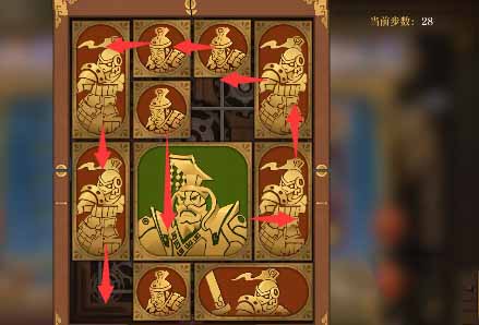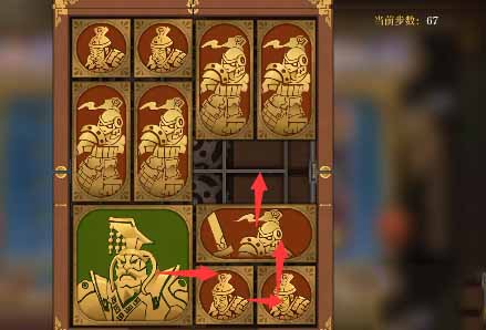 4、右下的小方塊向上移動,將軍向右一格,左上角的豎直方塊向下,上方全員向左,右側全部方塊向上一格,左下角的水平方塊和小方塊向右一格。