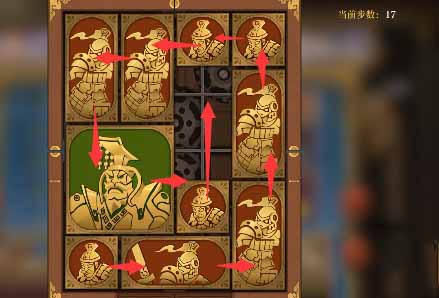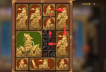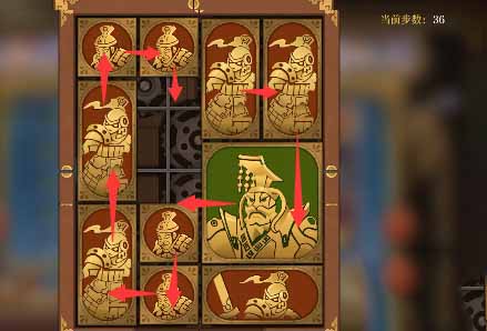 1、左上角豎直方塊向上一格,右上角小方塊移動到中間的空位,右側全體上移,下側全部右移,左側小方塊向下移一格,然後將軍向左一格。