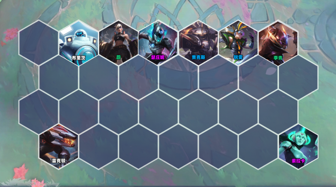 1.陣容組成:【鱷魚、機器人、盲僧、蔚、銳雯、武器、奶媽、豬妹】;