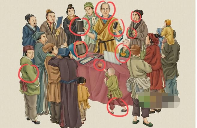 2、圖中左邊綠衣服的人是平民,小孩子穿著平底鞋,桌子上有屏幕、蘋果