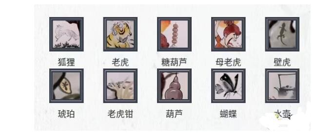 狐狸、老虎、糖葫蘆、母老虎、壁虎、琥珀、老虎鉗、葫蘆、蝴蝶、水壺