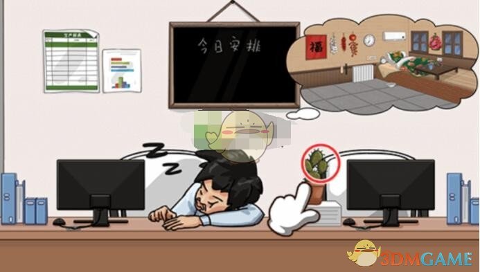 2、然後會發現主角其實是在罷辦公室睡覺做夢,用仙人掌戳破男主的夢,男主就會醒啦