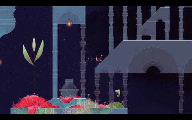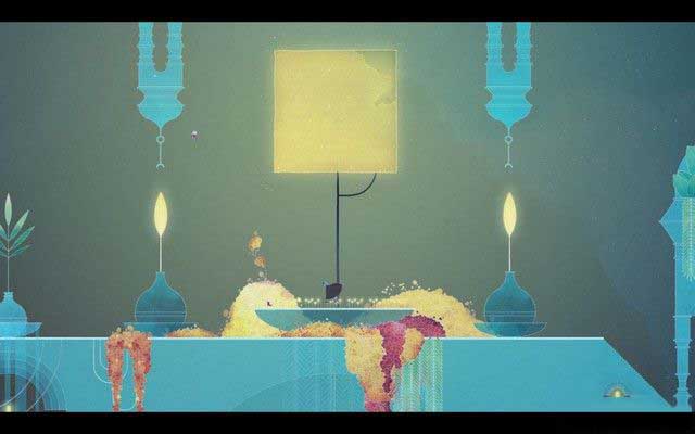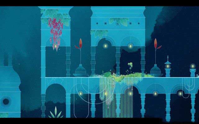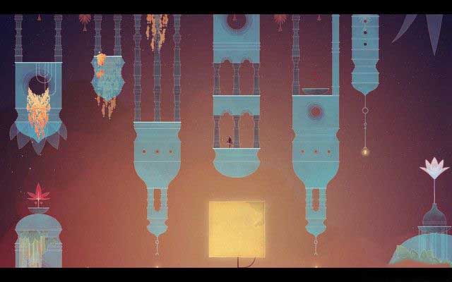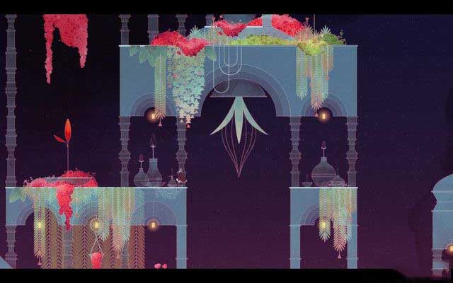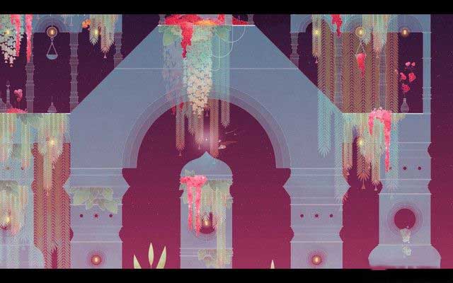 往左邊走,找打黃色的花叢,利用它點亮房間,將隱藏的建築顯現出來,