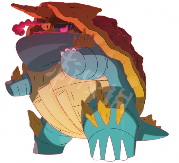 超極巨化的暴噬龜受超極巨化的力量影響,變得能夠用後肢站立,直立行走。它的身姿變得更加粗壯,而頭上的角也發生了改變,背後的龜殼看起來就像是凹凸不平的山。