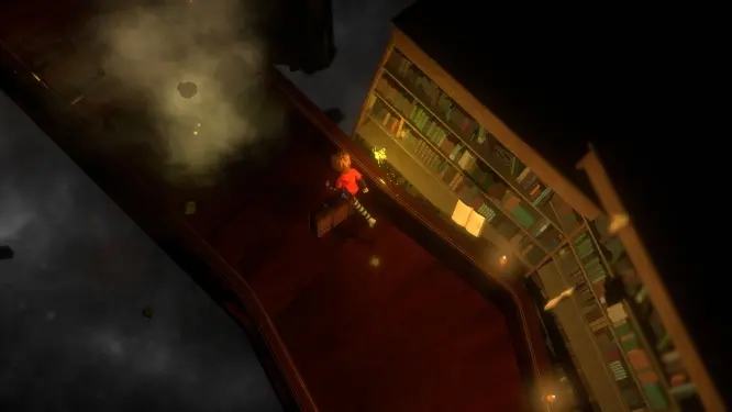 這很顯然是一個演出意義大過實際玩法本身的過渡段落,遊戲本可以在此階段放棄那個懸頂的視向,轉而從側面視角穿插切入,一方面能夠展現巨型怪物的龐大與可怖,另一方面亦能比對出角色的渺小與無力感,這種讓鏡頭調度為演出效果而服務的手段應當很常見,但《暗夜長夢》在此卻仍選擇了固持己見,從而犧牲了應得的觀賞性。