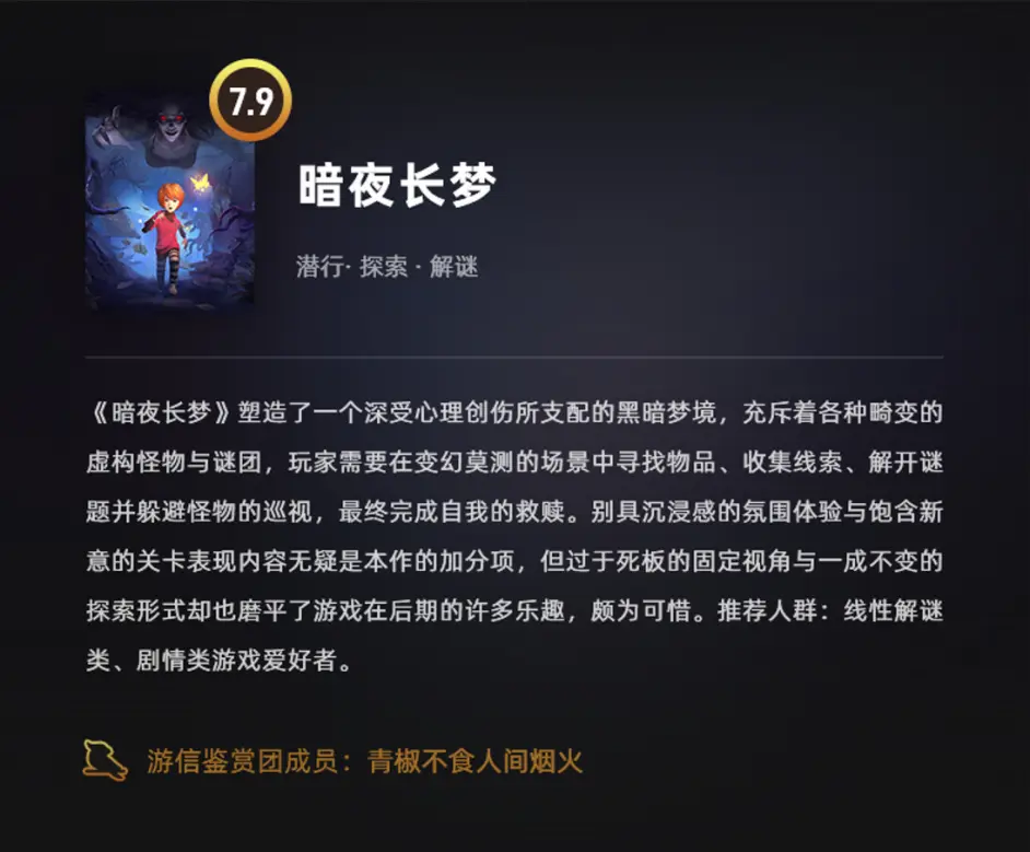 作為「索尼中國之星計劃」第五年上陣的作品,儘管《暗夜長夢》在外表成色上未能展現出如部分前輩那般「出手即驚艷」的程度,但其立足的題材與內容也依然在國內市場的細分領域上做了一些令人驚喜的全新嘗試,以紮實的體量打造了一部更注重心理恐怖與劇情的俯視角線性解謎遊戲。