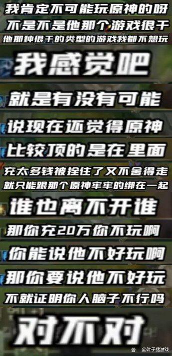 電棍認為,《原神》是一款比較「干」的遊戲。玩家們前赴後繼地加入,其實是被「拴住」了。電棍本人對拴住的解釋是:「充太多錢被拴住了,不捨得走只能牢牢綁在一起誰也離不開誰。你充20萬說他不好玩,不就證明你腦子不行嗎?」