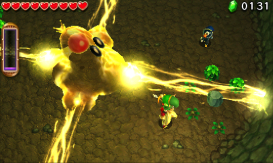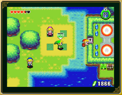 顧名思義,《四之劍》當然是要有4個林克啦。叫上3個小夥伴,把聯機線插入各自的GBA中,就可以一起冒險了。不同於後來的《三劍客》,《四之劍》在玩法上要更傳統一些,除了多人配合的一些機關外,還是和普通的2D塞爾達比較類似的。