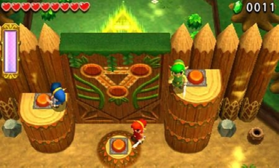 《三劍客》顧名思義就是有三位賽……咳咳,三位林克。整個遊戲所有的關卡,都需要三位林克互相配合來完成。藉助3DS獨特的裸眼3D效果,本作設計了一個疊疊樂的玩法。三位林克需要舉高高,來達到過關需要的高度。(當然,沒有裸眼3D也能玩,只是缺少景深效果)