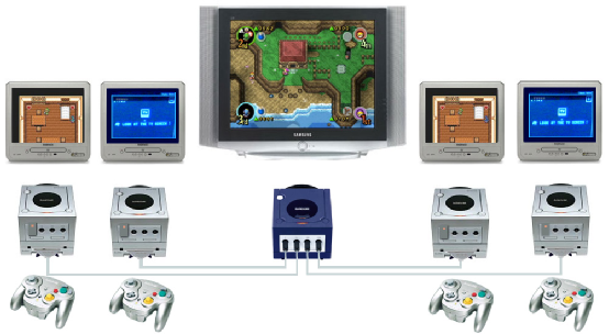 如果你有錢的話,也可以買5台NGC,和4個NGC用的GBA拓展,這個拓展就相當於一台GBA實機,可以把GBA畫面輸出到電視機上。