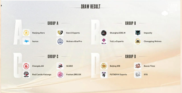 目前,小組賽已經結束,剩下的8支隊伍抽簽對陣,使用BO7單敗淘汰制,決出世冠四強。八支隊伍分別為中國成都AG、中國重慶狼隊、中國佛山DRG、中國上海EDG、中國武漢eStarPro,中國南京Hero、中國北京WB、中國XYG。