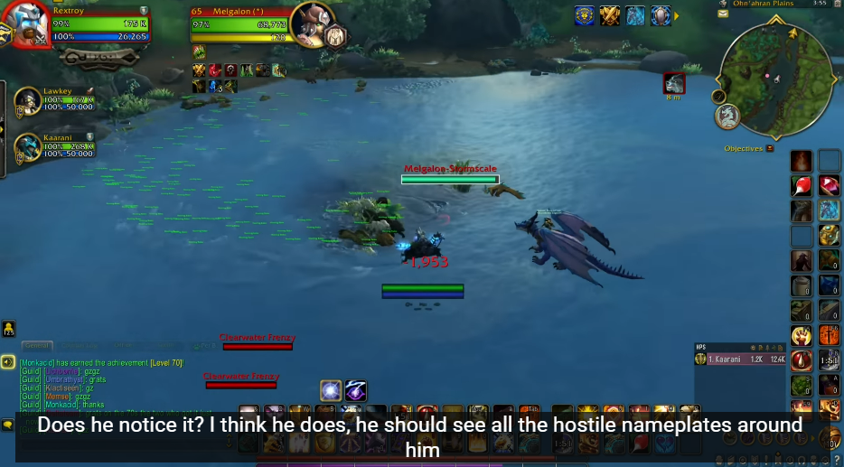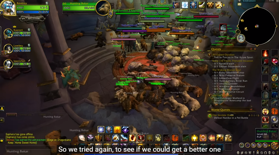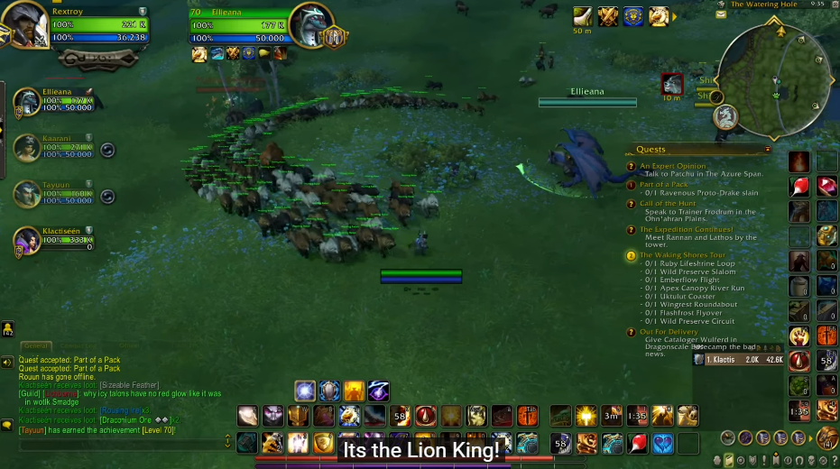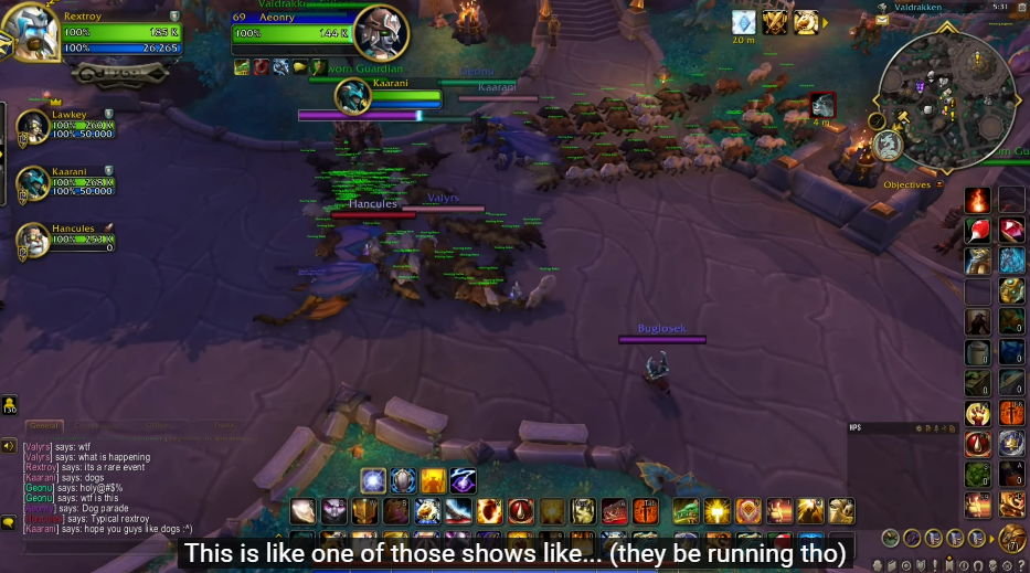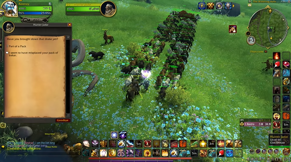 這名玩家是Rextroy,他經常發掘一些特殊玩法,包括單刷BOSS,探索隱藏地圖等。這回的惡作劇源於10.0的任務Bug,在歐恩哈拉平原有一個半人馬的任務叫做「Part of a Pack」,此任務會讓你召喚一隻獵犬bakar,幫助你狩獵該區域的巨龍。每次召喚成功之後,玩家將獲得一個Debuff,防止你再次召喚,不過Rextroy發現他的聖騎士開無敵似乎可以清除這個Debuff,然後他在聖盾期間連續召喚,一共召出了300多條狗。