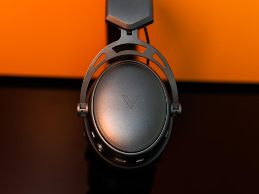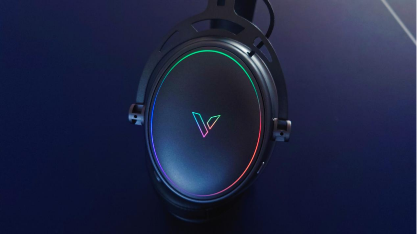 耳機機身刻畫著「V」的抽象線條圖案,既是雷柏的系列品牌LOGO圖案,同時也作為RGB組件,與環繞耳機一圈的燈條共同打造炫彩燈效。