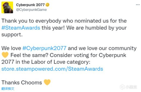 感謝今年提名我們參加Steam大獎的所有人!我們對您的支持感到愧不敢當。我們熱愛《賽博朋克2077》,熱愛我們的社區,有同樣的感覺嗎?考慮在「愛的付出」類別中為《賽博朋克2077》投票地址: