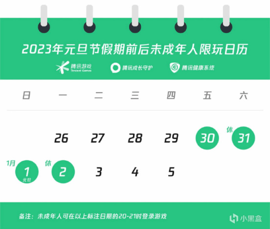 騰訊遊戲發布元旦節假期前後未成年人遊戲限玩的通知,12月30日-1月2日(周五及元旦節假期)每日的20時至21時之間,未成年人可登錄遊戲(遊玩時間共計4小時),其餘工作日均為禁玩時段。