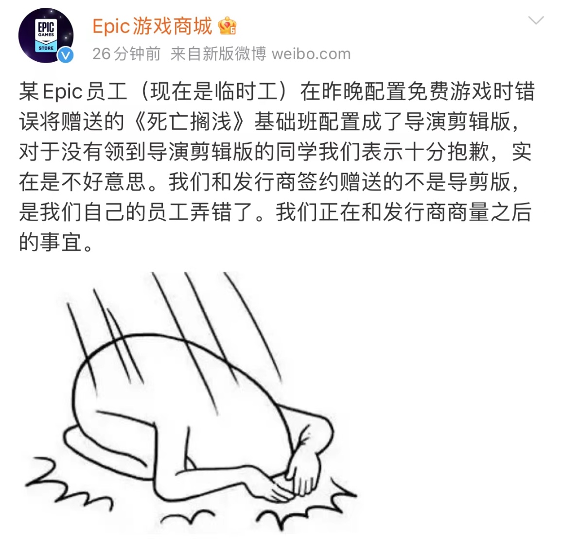 某Epic員工(現在是臨時工)在昨晚配置免費遊戲時錯誤將贈送的《死亡擱淺》基礎版配置成了導演剪輯版,對於沒有領到導演剪輯版的同學我們表示十分抱歉,實在是不好意思。我們和發行商簽約贈送的不是導剪版,是我們自己的員工弄錯了。我們正在和發行商商量之後的事宜。