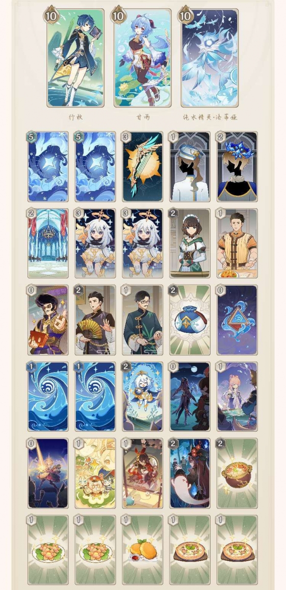 純水精靈起手,先放置支援牌進行優勢積攢,幻化出第一批召喚物然後切甘雨進行第二回合開局凍結,以食物和事件進行前期運營,在期間反復利用恢復血量和凍結對方主要角色進行消耗,可以利用行秋作為肉盾進行關鍵抵擋抗傷,最後以甘雨霜華矢進行清掃戰場以取得對局勝利。
