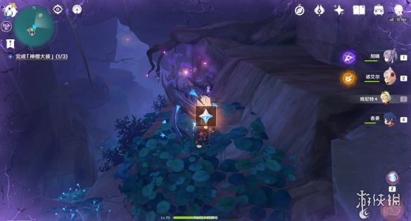 往下跳,獲得雷神瞳一,在崖壁上召喚雷種子,朝洞里指引方向飛,前往鳥居。