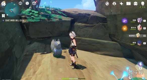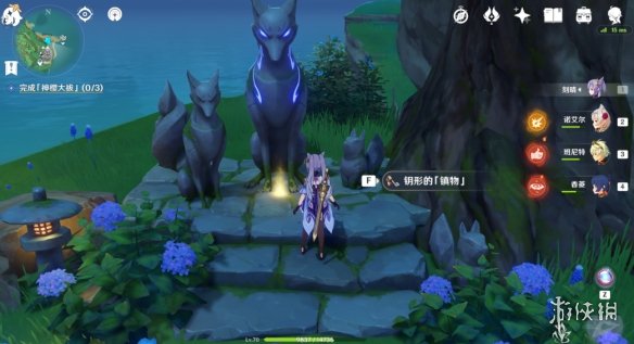 在半山腰位置,使用「留念鏡」調查「地狐」雕像,切換雷元素角色攻擊「天狐」雕像,獲得鑰形的「鎮物」。