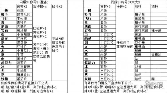遭遇力方面,單屬性食材每份是遭遇21+捕獲12,所以標準配置就是5份食材疊出105遭遇,然後在口味上避免酸甜/甜酸給捕獲力懟到160引發翻車,因此酸+甜秘傳的組合就別看了100%要被干碎。在這之外,當你使用酸+酸或者甜+甜的時候,如果選擇的食材組合恰好把甜 / 酸懟到了次高項同樣會翻車。同時,由於單屬性食材的一式三份性質,做起來總體會比較麻煩,一般會期望使用盡量小的食材。